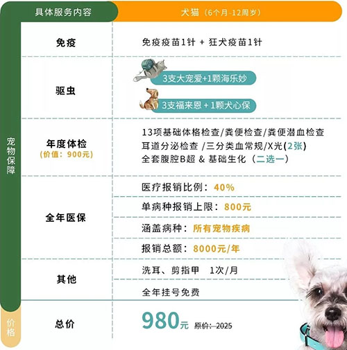 保障:宠物的全年医保,报销所有疾病,看病一年最多可报销8000元。