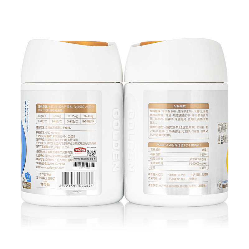 原料组成:羊肉粉20%、冻羊肉17%、木薯粉、葡萄糖胺盐酸盐、鸡油、胶原蛋白(3%,牛骨胶原蛋白肽)、鸡肝粉、亚麻籽、绿唇贻贝、蛋黄粉、姜黄(含姜黄素)。添加剂组成:硫酸软骨素(含鲨鱼来源)、卵磷脂、氯化钠、氯化钾、三聚磷酸钠、丙三醇、柠檬酸、抗氧化剂、迷迭香提取物。