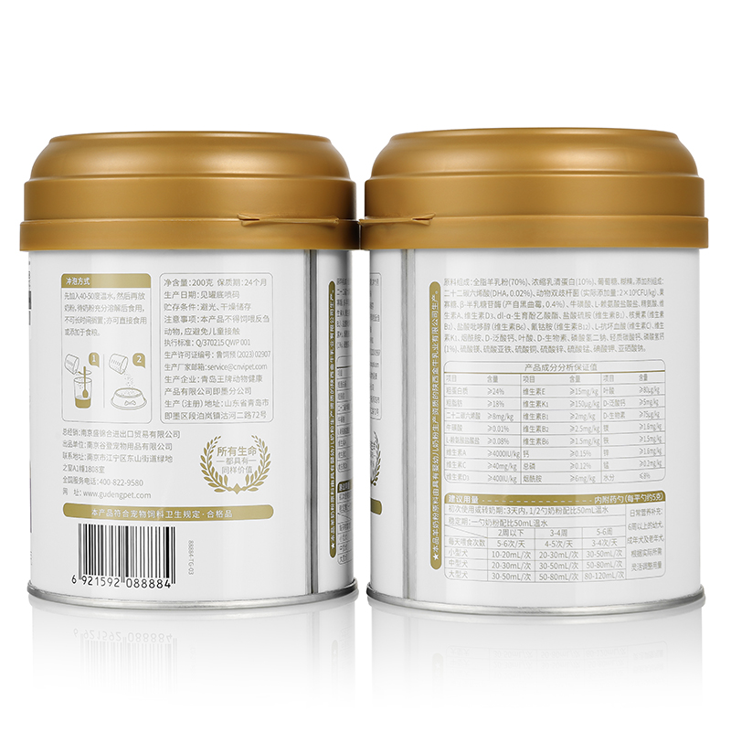 原料组成:全脂羊乳粉(70%)、浓缩乳清蛋白(10%)、葡萄糖、糊精。添加剂组成:二十二碳六烯酸(DHA,0.02%)、动物双歧杆菌(实际添加量:2×109CFU/kg)、果寡糖、β-半乳糖苷酶(产自黑曲霉,0.4%)、牛磺酸、L-赖氨酸盐酸盐、精氨酸、维生素A、维生素D3、dl-α-生育酚乙酸酯、盐酸硫胺(维生素B1)、核黄素(维生素B2)、盐酸吡哆醇(维生素B6)、氰钴胺(维生素B12)、L-抗坏血酸(维生素C)、维生素K1、烟酰胺、D-泛酸钙、叶酸、D-生物素、磷酸氢二钠、轻质碳酸钙、磷酸氢钙(1%)、硫酸镁、硫酸亚铁、硫酸铜、硫酸锌、硫酸锰、碘酸钾、亚硒酸钠。